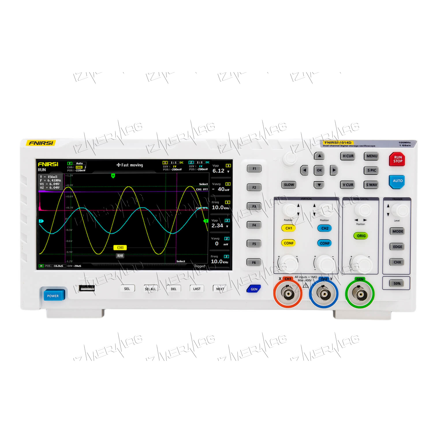 Прецизионный осциллограф FNIRSI 1014D (2 канала, 100 МГц) – двухканальное устройство, предназначенное для контроля частоты сигналов в электронном оборудовании. Прибор оснащен цветным экраном, на который выводятся полученные значения в виде графиков. Есть три режима синхронизации - автоматический, нормальный, однократный. Предусмотрена опция записи сигнала, информация сохраняется во встроенной памяти объемом 1 ГБ. Осциллограф оснащен функциями автоизмерения, Roll, Лиссажу. Встроенный генератор частоты поддерживает 14 типов сигналов. В комплекте есть два измерительных щупа.